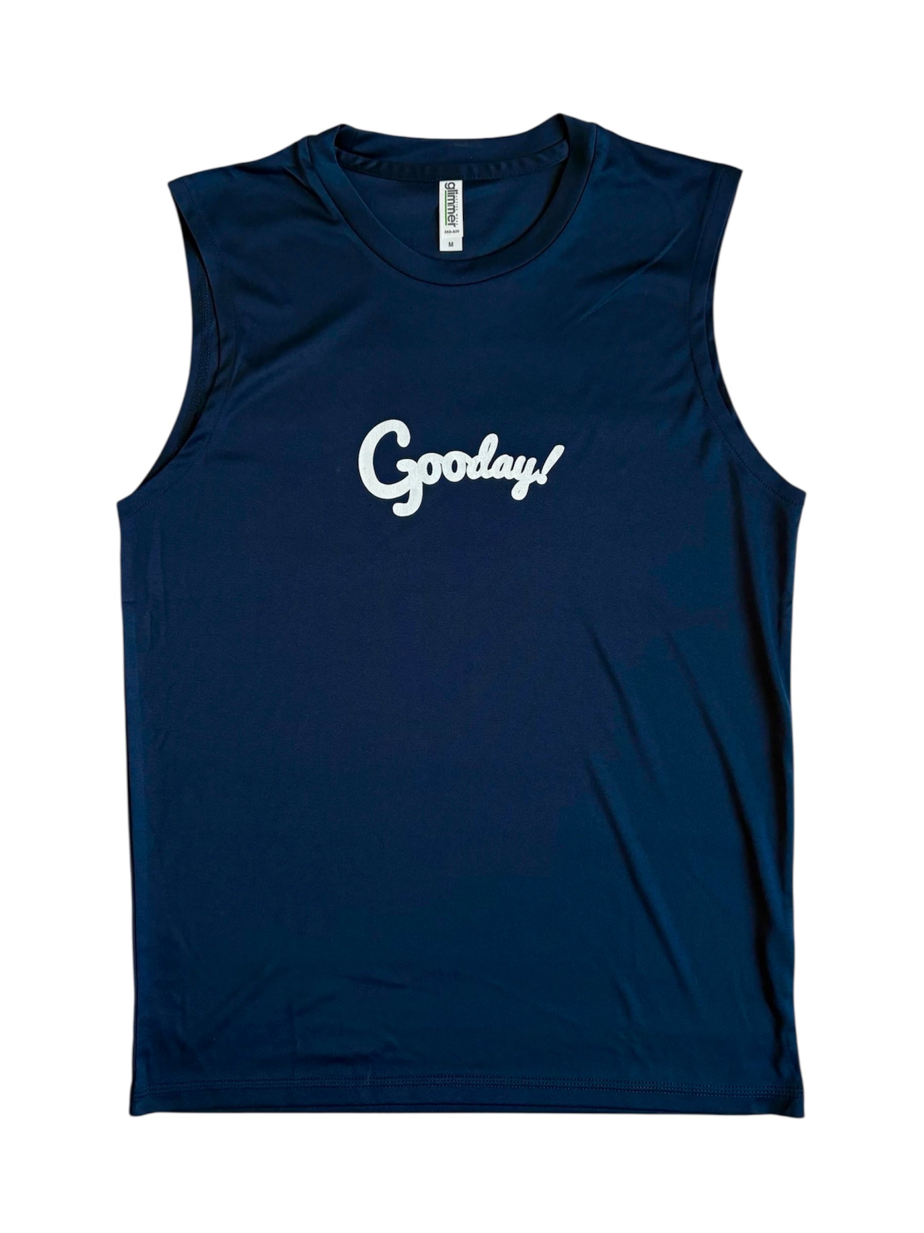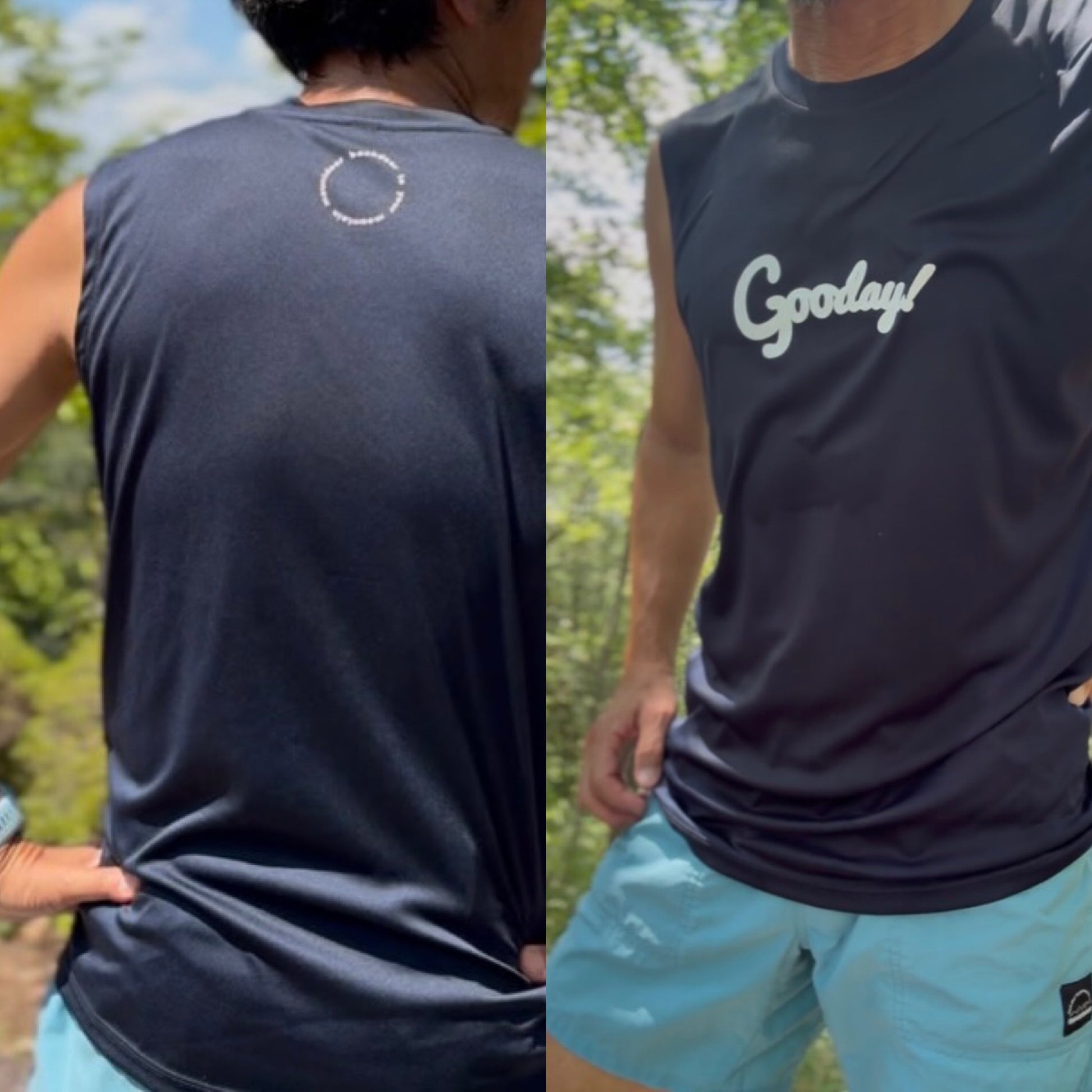 気持ちよく人と出会いたい、そんな気持ちで作ったのがGooday! No-sleeveです。Good day! capで採用していたデザインですが、もっと目立ったところにメッセージとして表現したいとの思いで暑い夏に向けてノースリーブにしました。